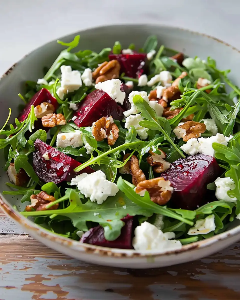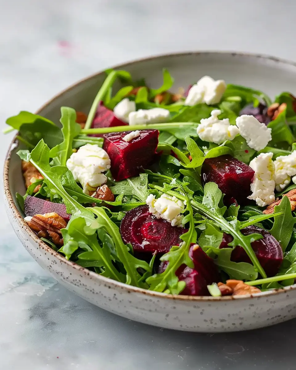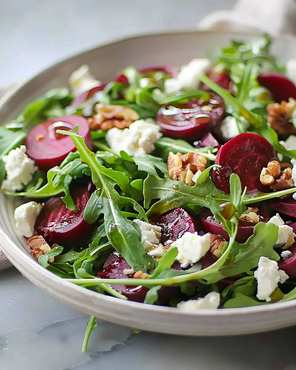 Imagine a bowl brimming with peppery arugula, sweet roasted beets, and creamy goat cheese—sounds tempting, right? The combination of flavors in this salad is simply delightful. The peppery notes of arugula provide a perfect contrast to the earthy sweetness of the beets, while the tangy goat cheese adds a creamy richness that brings everything together.