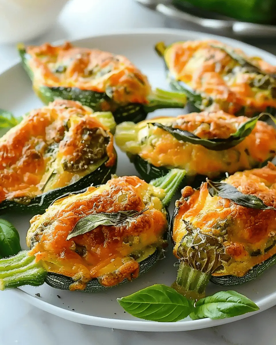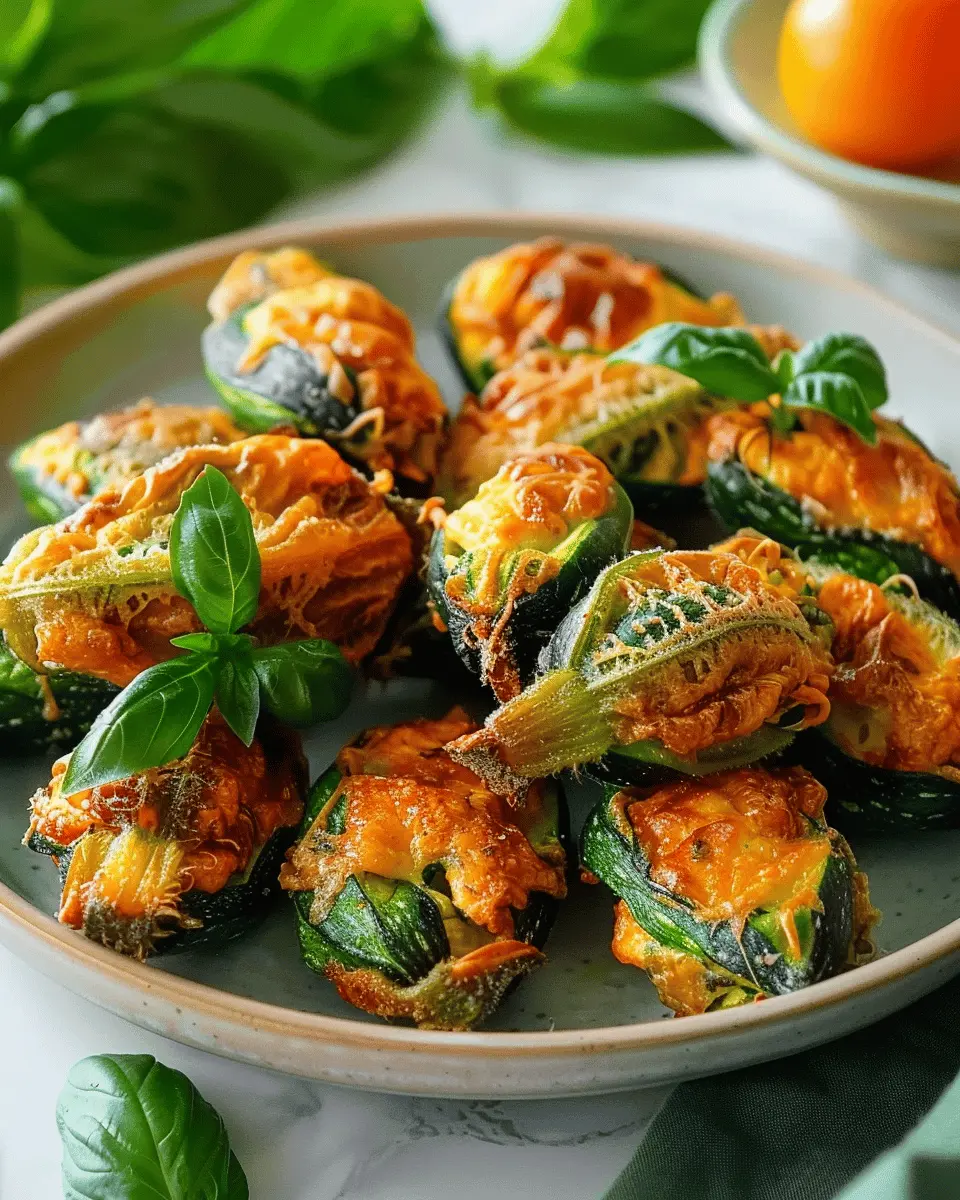 These lovely stuffed flowers shine as both an appetizer and a light meal. For a delightful starter, serve them warm alongside a simple salad featuring leafy greens and cherry tomatoes. If you’re in the mood for something more substantial, plate the zucchini flowers with a side of grilled vegetables or quinoa for a wholesome and satisfying meal.