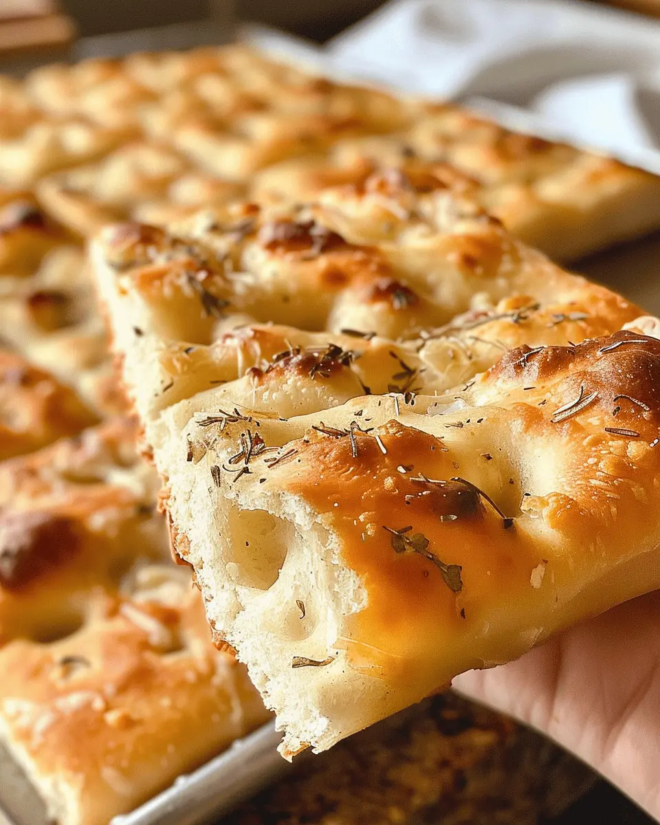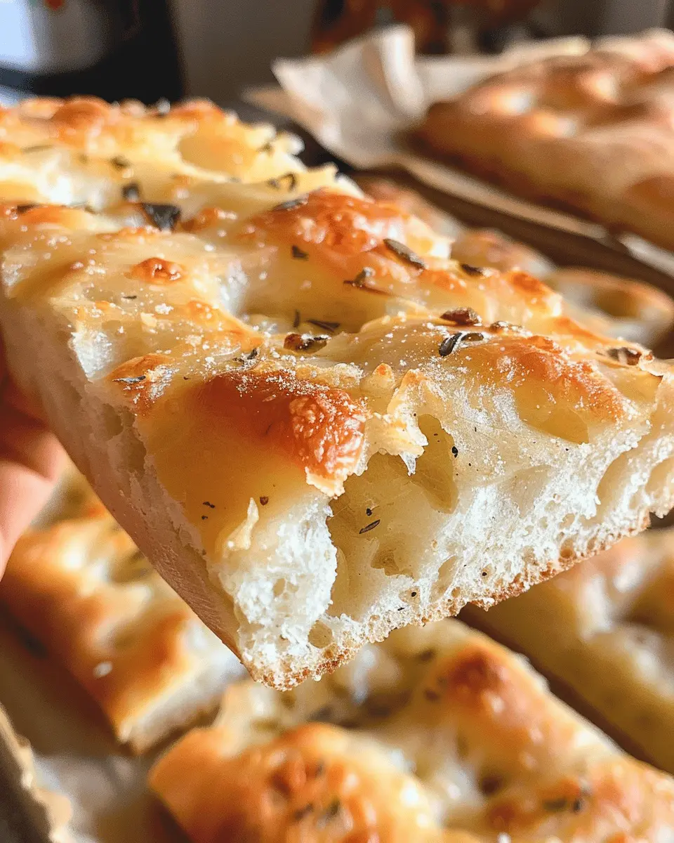 • Instructions: Sprinkle your focaccia with olive oil, herbs, and any toppings you love—think cherry tomatoes, olives, or indeed, non-perishable cheese options. Bake for 20-25 minutes or until golden brown. Let it cool for a few minutes before slicing.