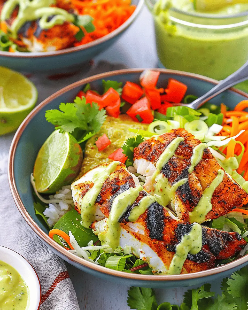 Keywords: Blackened Fish Taco Bowls, Cilantro Lime Sauce, Fish Tacos