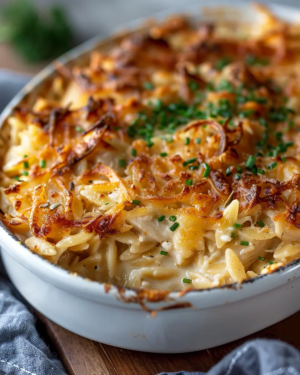 French Onion Chicken Orzo Casserole with Turkey Bacon Delight