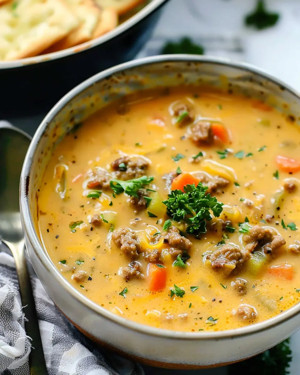 As you serve your Cheeseburger Soup, consider garnishing with crispy turkey bacon or green onions for an additional pop of flavor and texture. This hearty dish is sure to warm your soul and impress your taste buds, making it perfect for a cozy night in or a gathering with friends. Enjoy!
