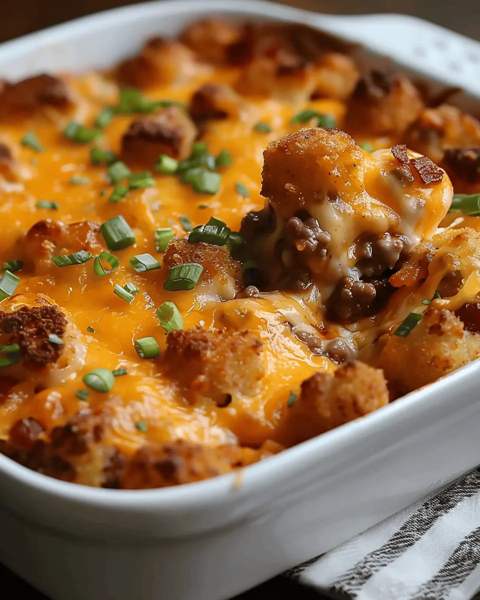 A comforting and delicious cheesy cheeseburger tater tot casserole recipe that is easy to prepare and loved by the whole family.