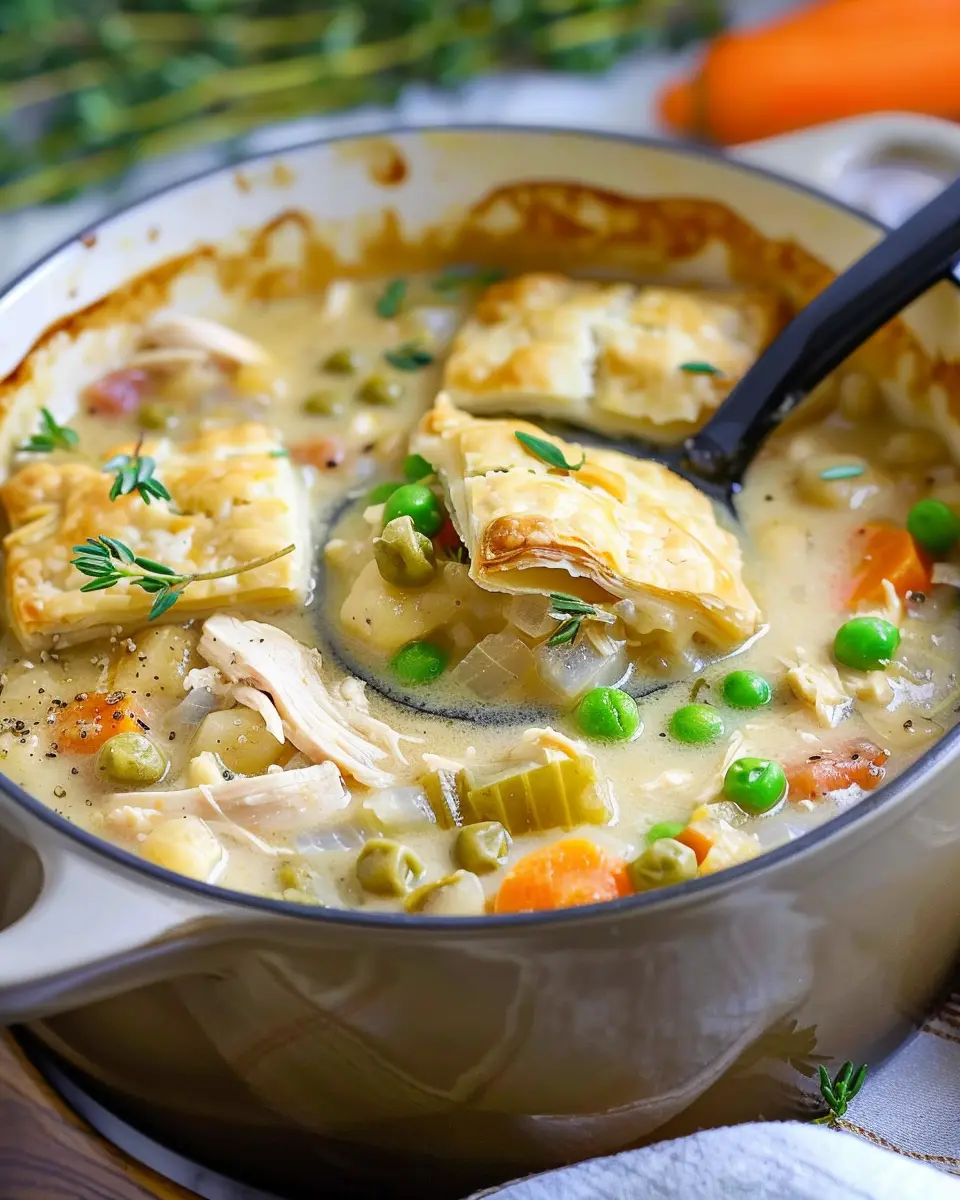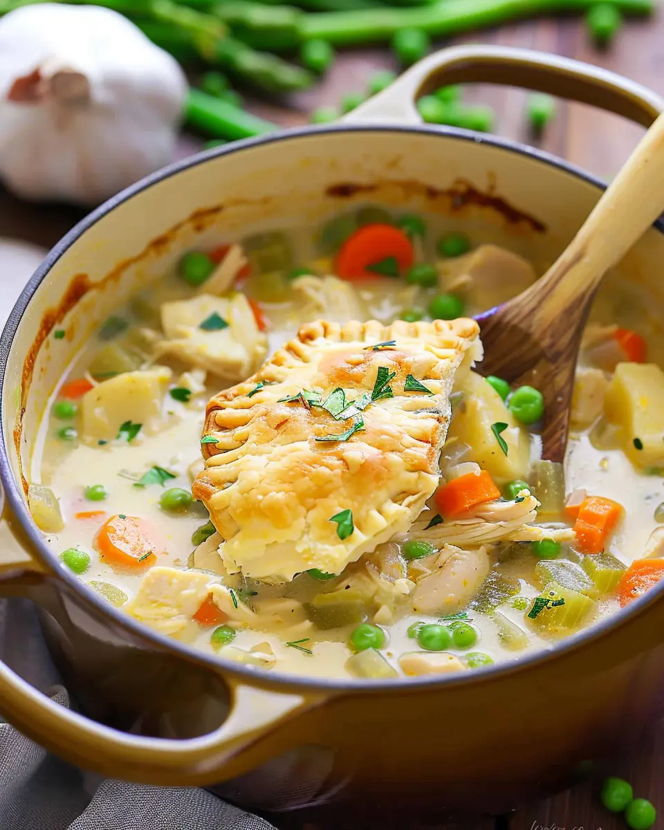 Once it’s done, serve your Chicken Pot Pie Soup in a hearty bowl, perhaps with some crusty bread on the side. You could even add a sprinkle of fresh herbs, like thyme or parsley, to brighten it up. Not only is this soup a treat for your taste buds, but it also warms your heart, making it the perfect meal for a cozy evening in.