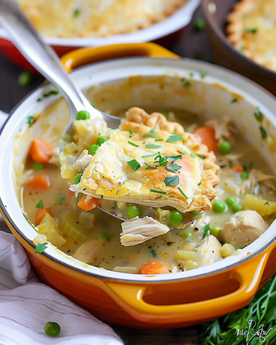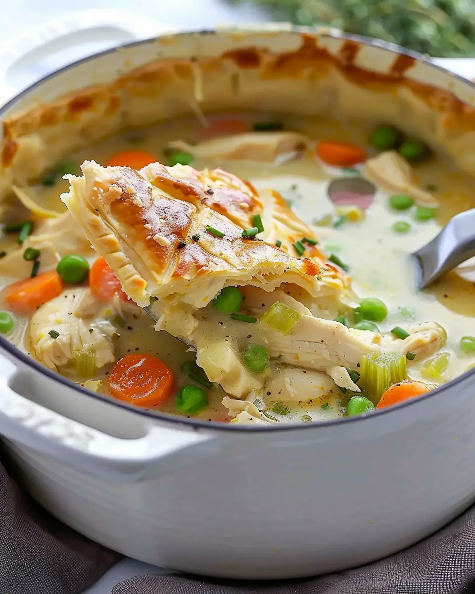 Let’s wrap up our delightful journey with chicken pot pie soup! This cozy dish is a fabulous way to warm up on a chilly day. The combination of tender chicken, rich broth, and seasonal veggies creates a comforting hug in a bowl.