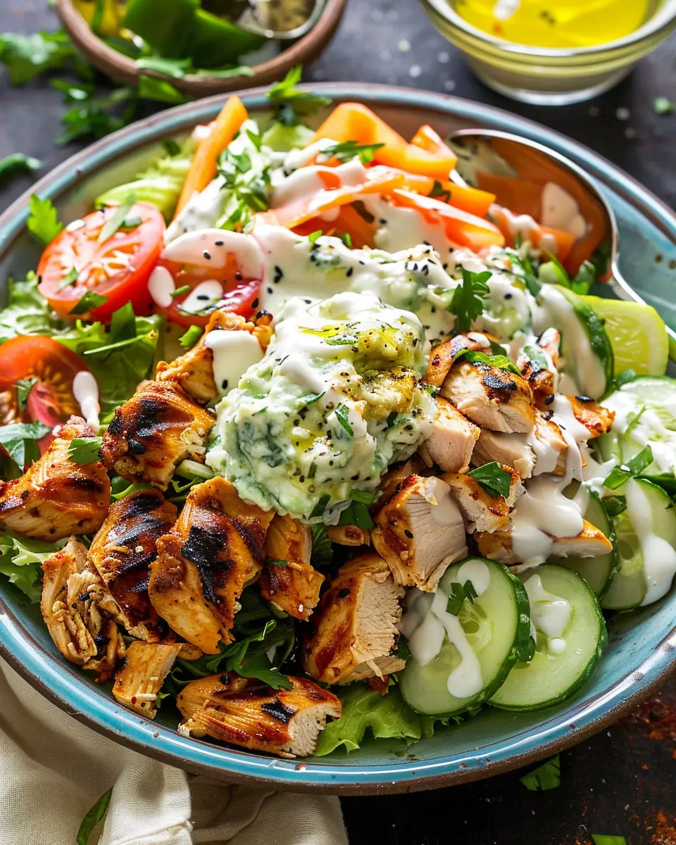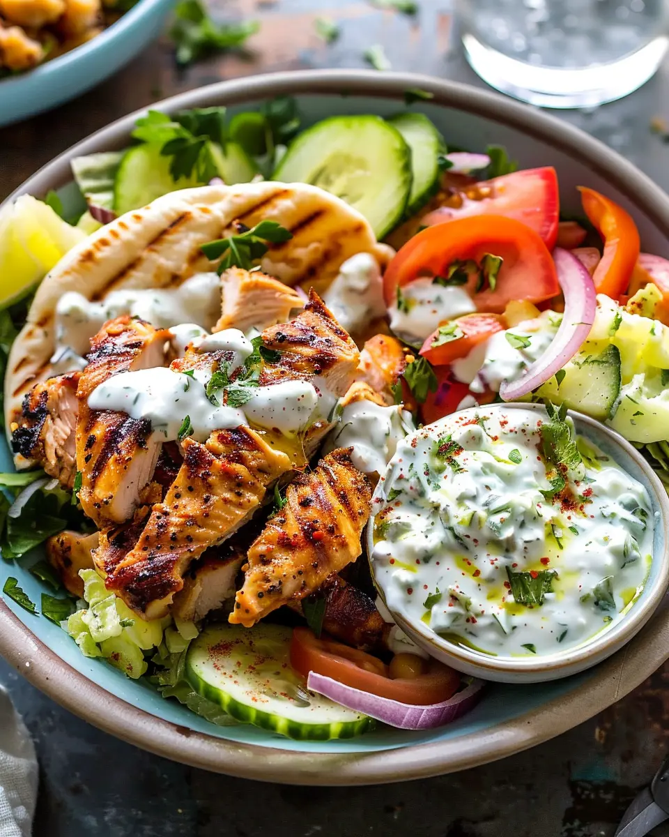 Now let’s talk sauce—a key element in any bowl! A homemade tzatziki, made with Greek yogurt, grated cucumber, garlic, lemon juice, and fresh dill, brings everything together beautifully. This creamy sauce is not only packed with flavor but also adds a cooling contrast to the warm chicken. A drizzle of extra virgin olive oil or a sprinkle of feta cheese afterward can amplify the experience even more.