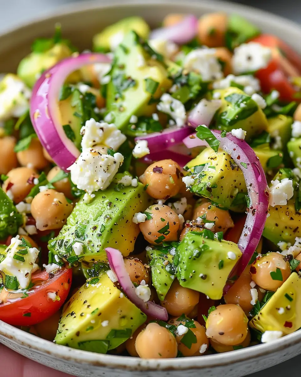 A refreshing and nutritious salad packed with chickpeas, feta, and avocado.
