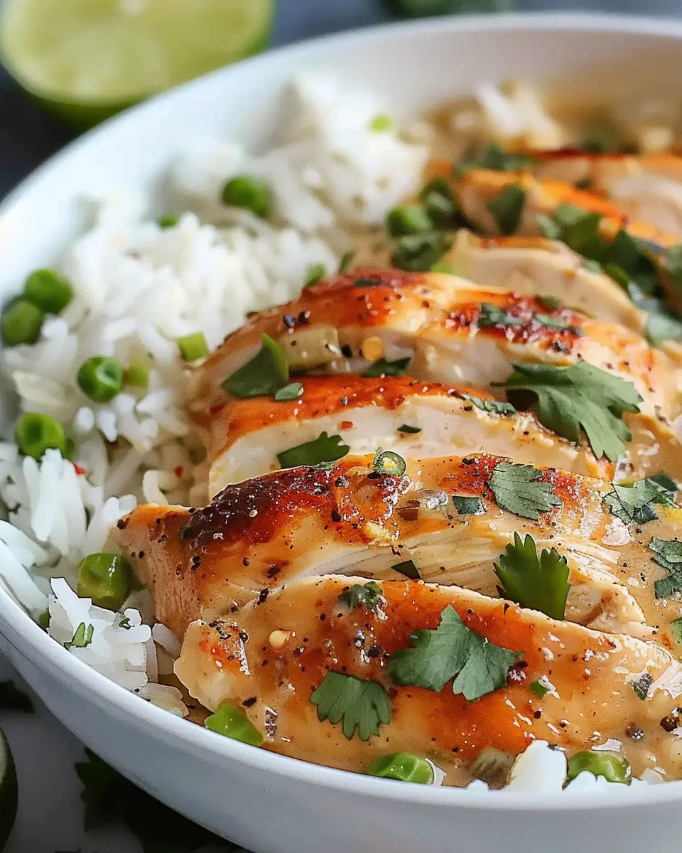 It’s almost time to dig in! Start by fluffing the coconut rice with a fork and then plate it as the base. Slice the chicken into strips and arrange it on top. Don’t forget those sautéed aromatics you cooked earlier; they add color and texture. Garnish with chopped cilantro and a few lime wedges on the side for a fresh touch.