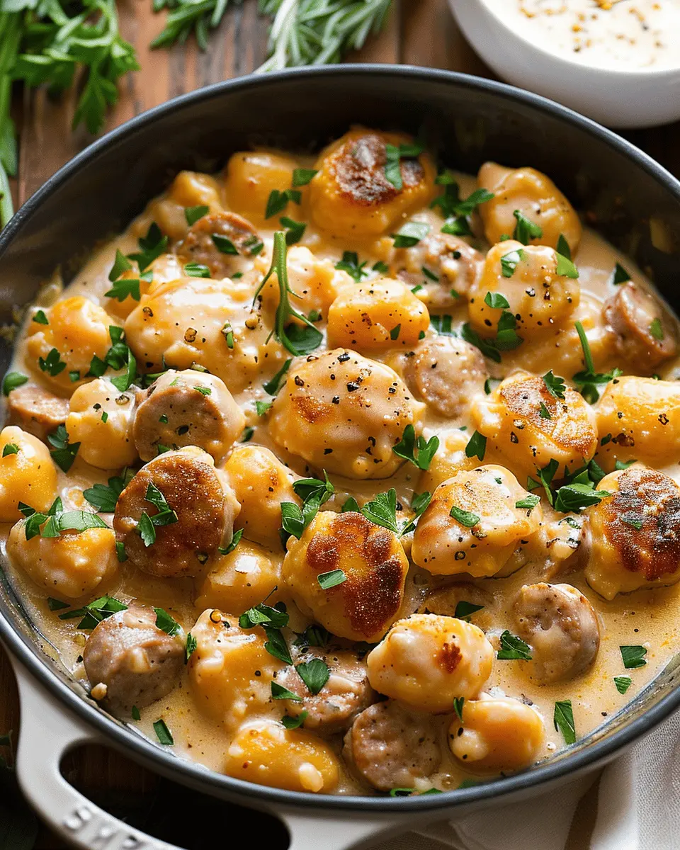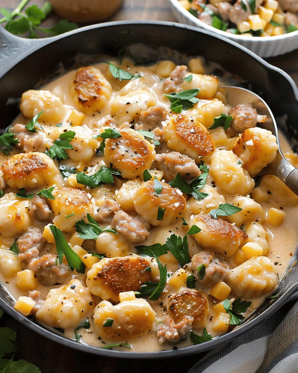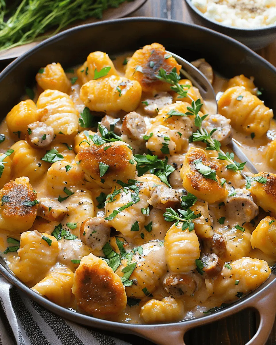 A comforting recipe featuring creamy butternut squash gnocchi paired with savory sausage, perfect for a cozy dinner.