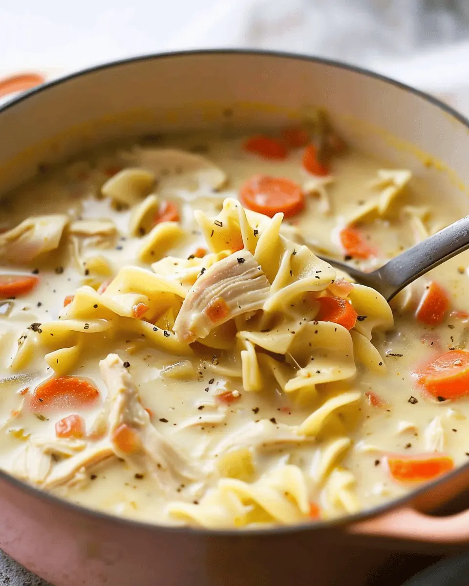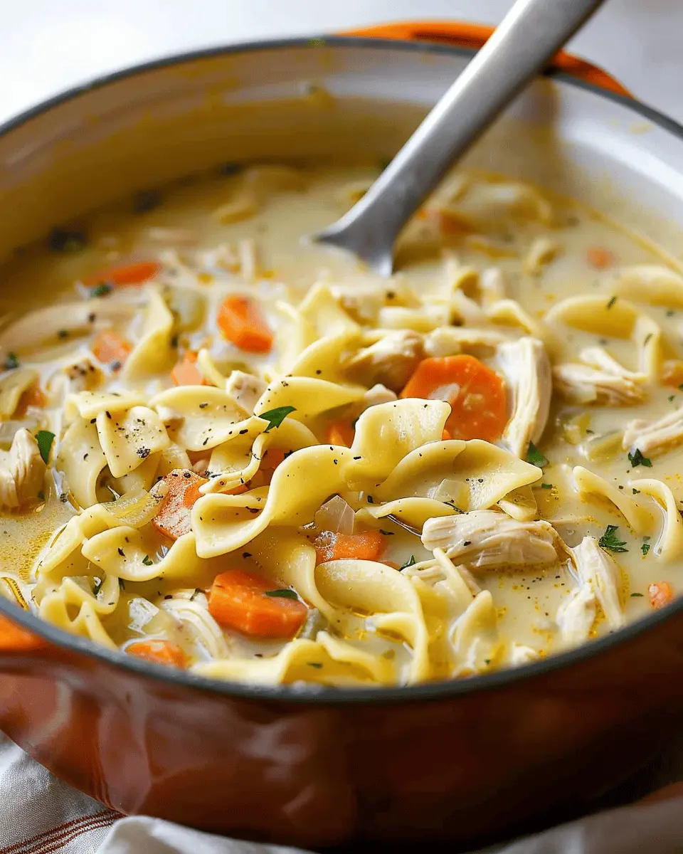 Once everything is tender and comforting, you can ladle your homemade creamy chicken noodle soup into bowls and dig in. This dish is perfect for cozy nights or when you need a little pick-me-up.