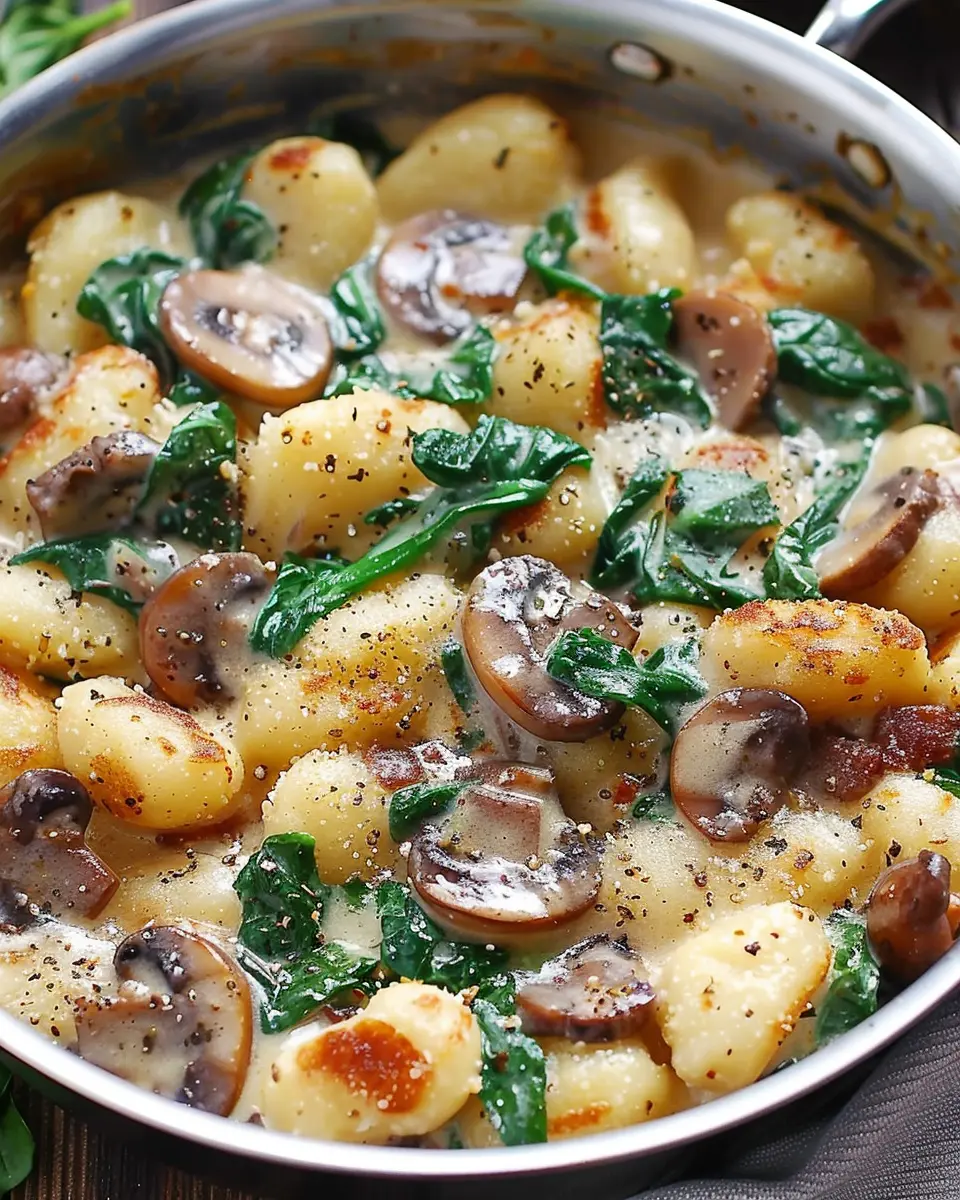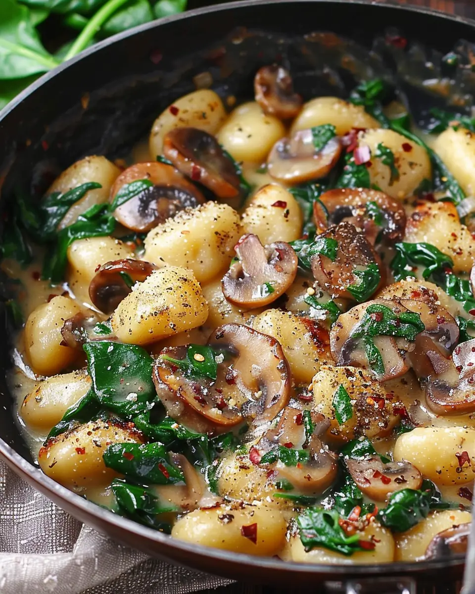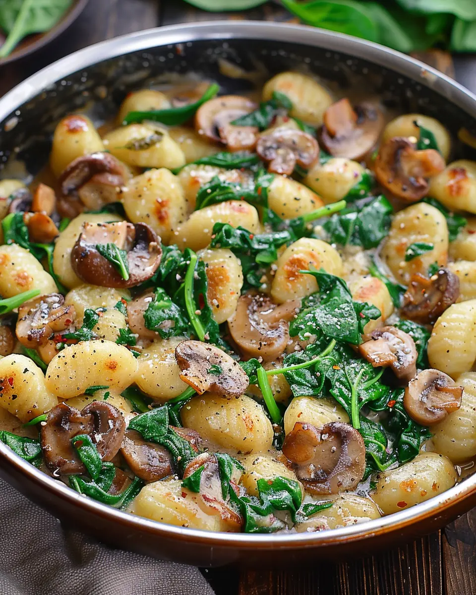 A rich and satisfying dish featuring soft gnocchi, fresh spinach, and savory mushrooms.