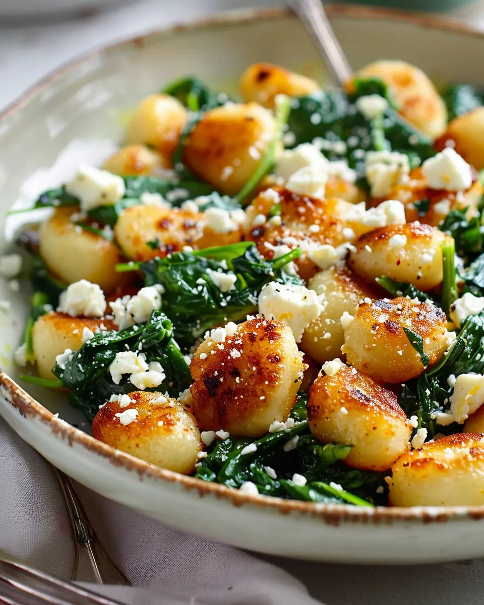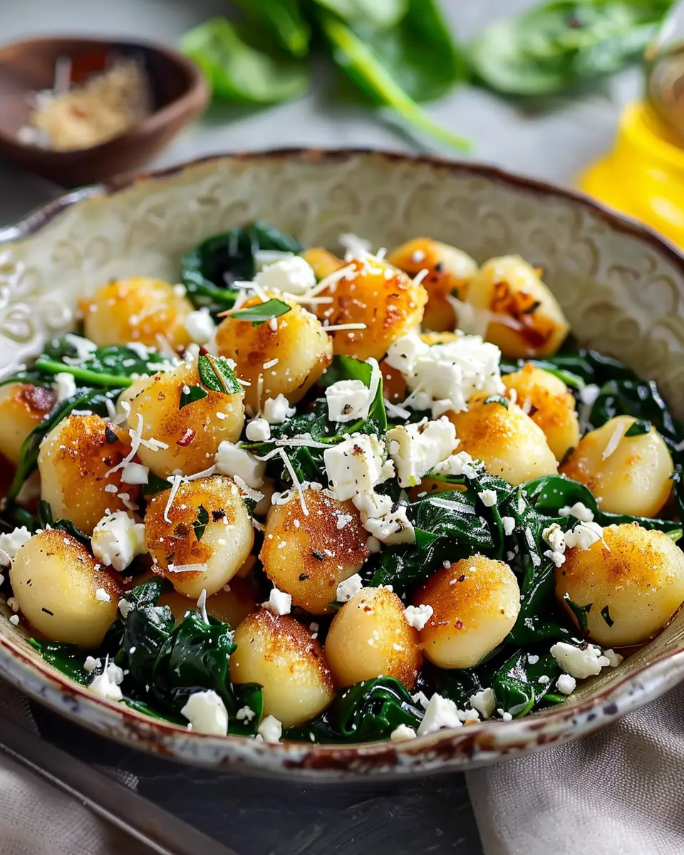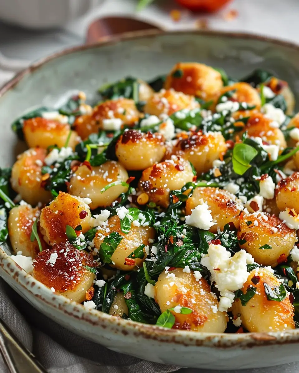 Delicious crispy gnocchi with fresh spinach and feta cheese, perfect for a quick weeknight dinner.