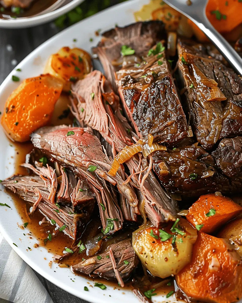 A hearty and flavorful beef roast cooked to perfection in a slow cooker. Perfect for family dinners.