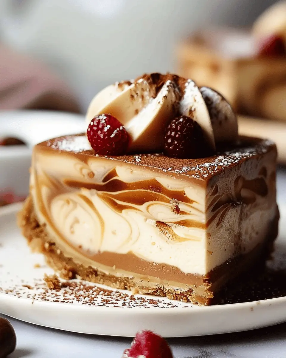 To elevate your cheesecake, create beautiful swirls by combining some of the filling with more espresso or a dash of cocoa.