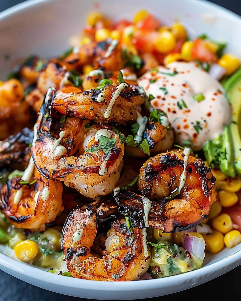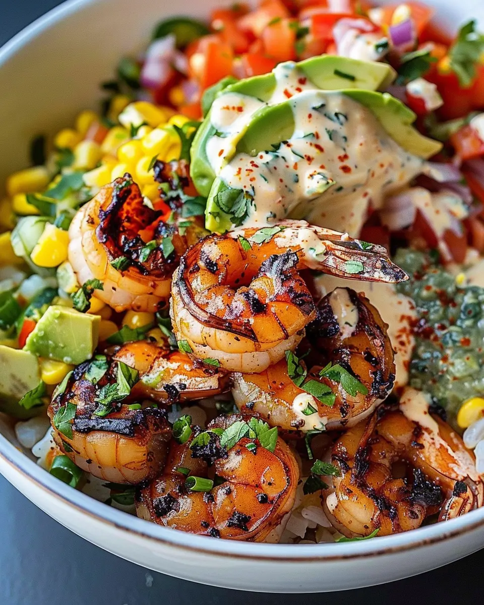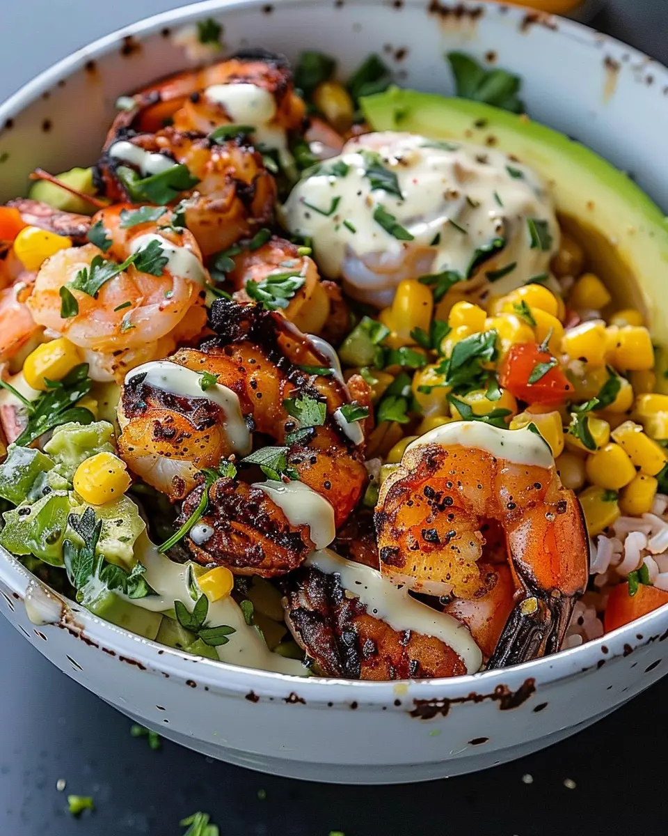 - Assemble the bowl by placing grilled shrimp over the avocado and corn mixture, then drizzle with creamy garlic sauce.