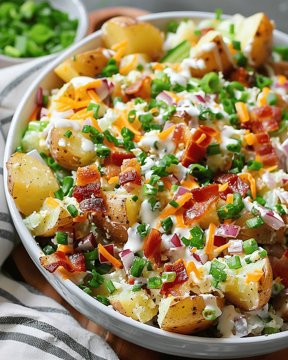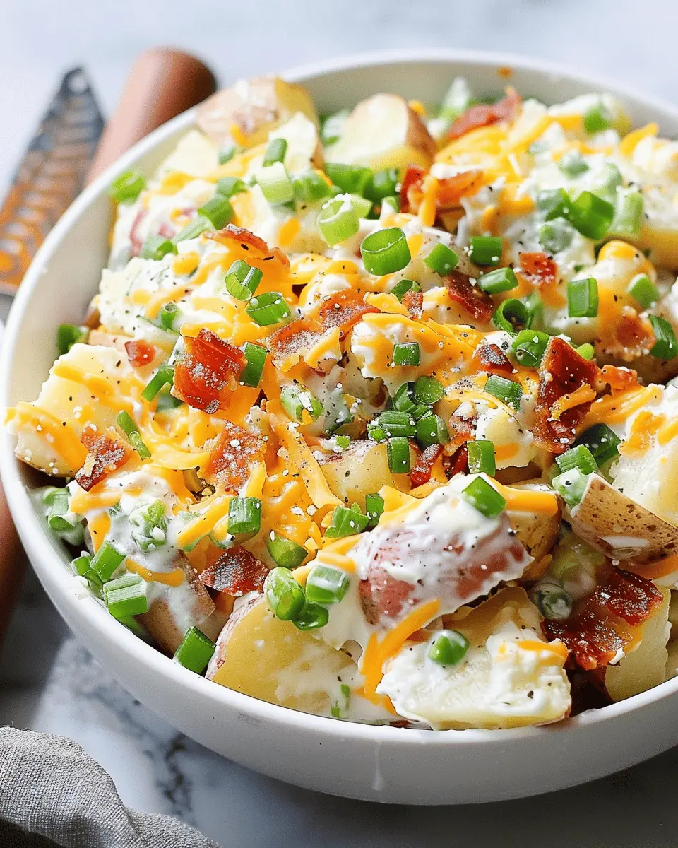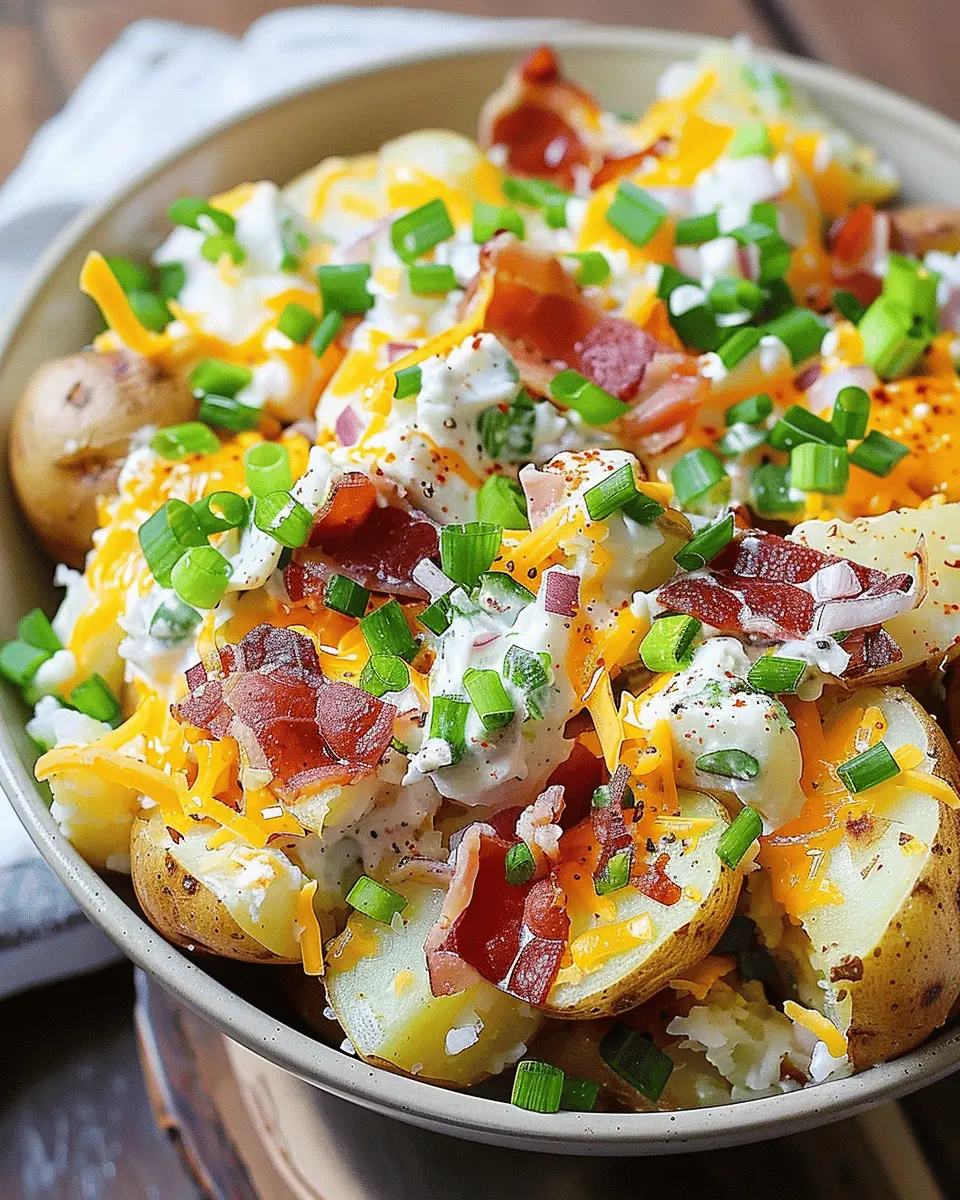 This loaded baked potato salad is an easy, satisfying dish that balances robust and creamy flavors, making it a go-to for any gathering. Happy cooking!