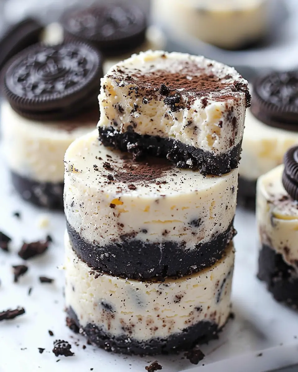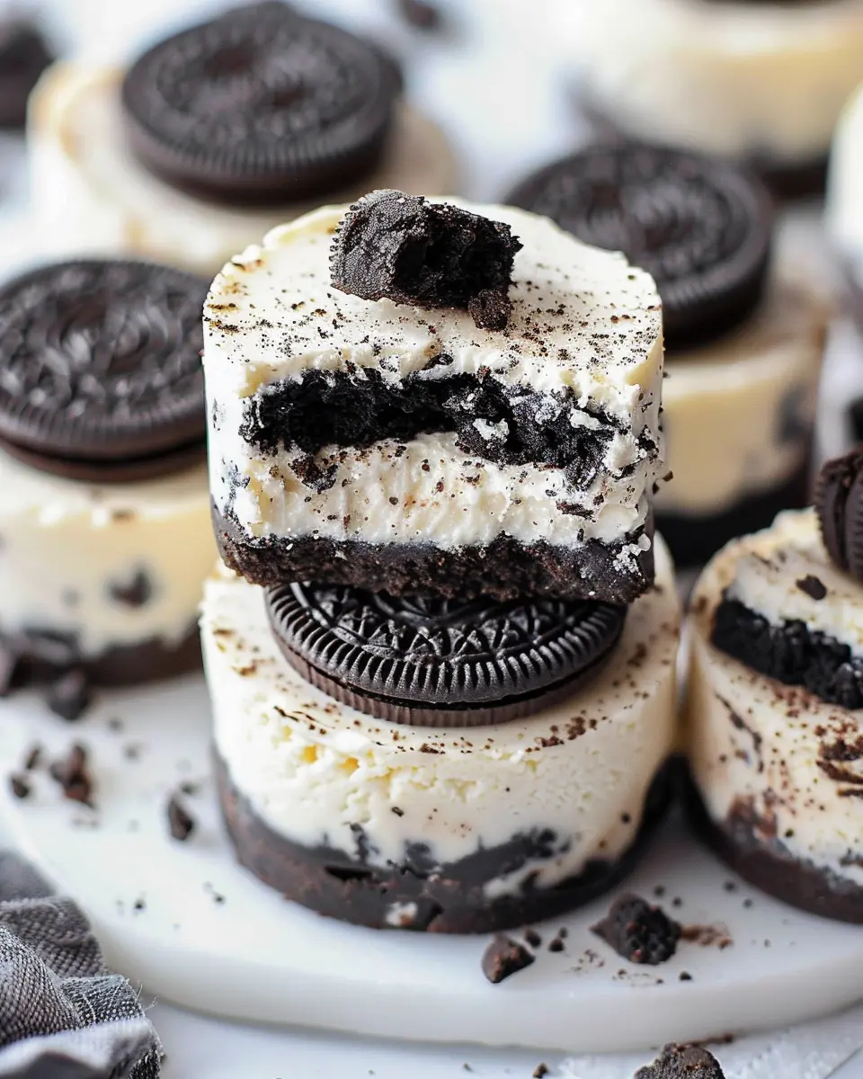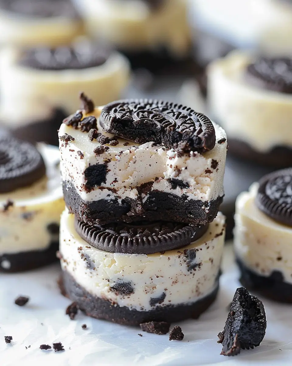 Short on time? No worries! These mini Oreo cheesecakes can be made as no-bake bites. Simply combine cream cheese, sugar, and whipped topping, then fold in crushed Oreos. Scoop the mixture into mini cupcake liners and chill until set.