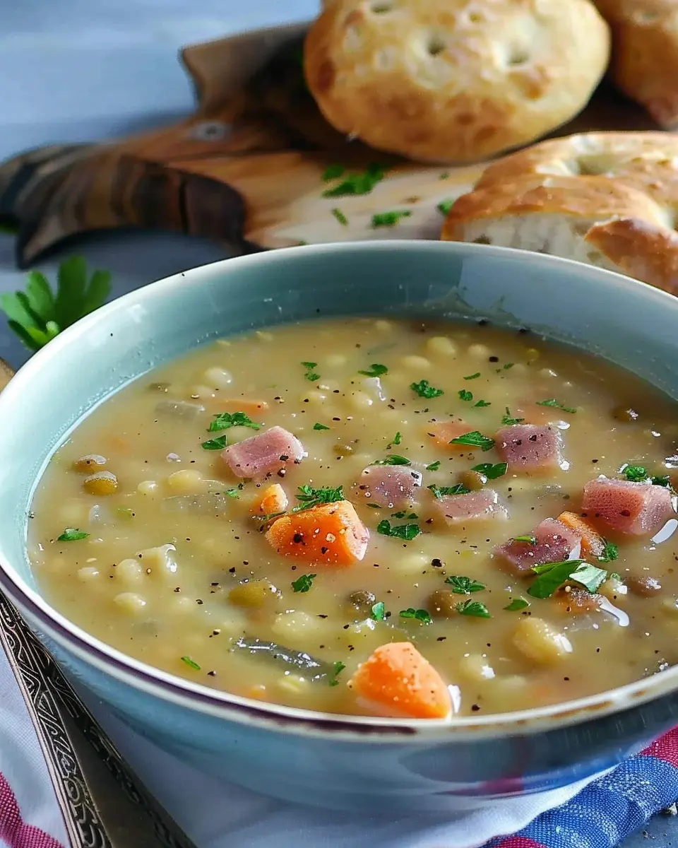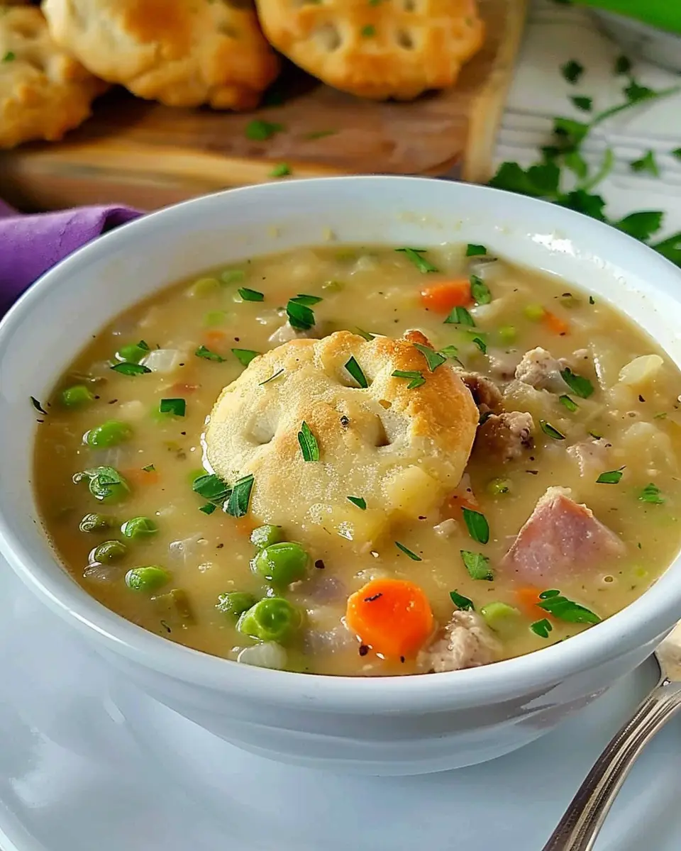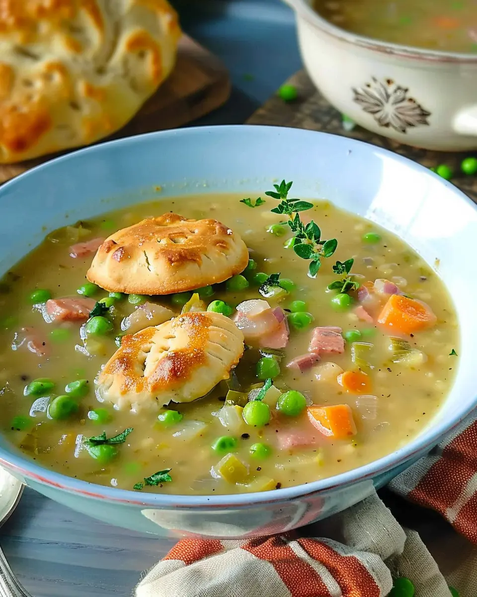 Nutritional Value: With the combination of protein from the Turkey Bacon and Chicken Ham, fiber from the split peas, and carbohydrates from the dough, this meal packs plenty of nutrients while being filling.
