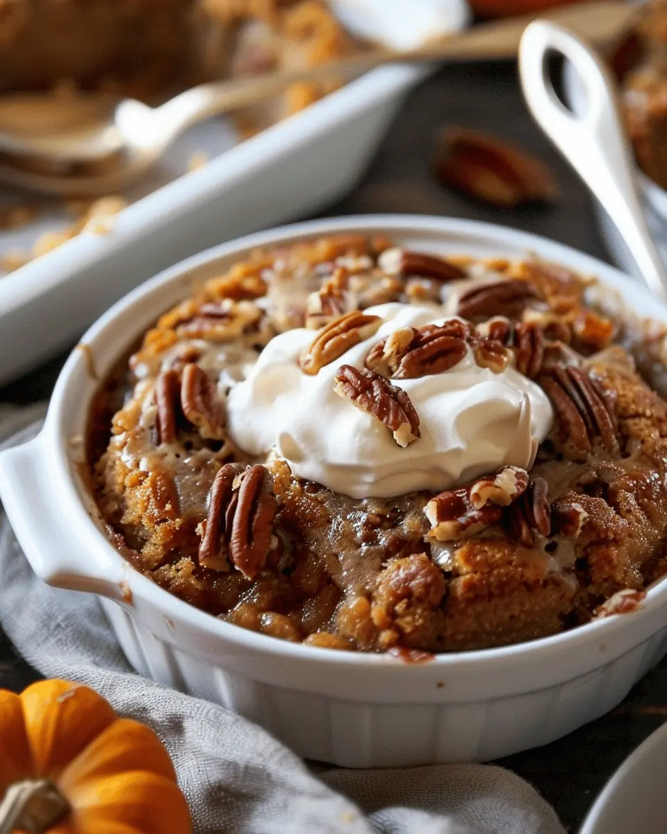 A warm, delightful dessert that embraces the flavors of fall with a combination of pumpkin and pecans.