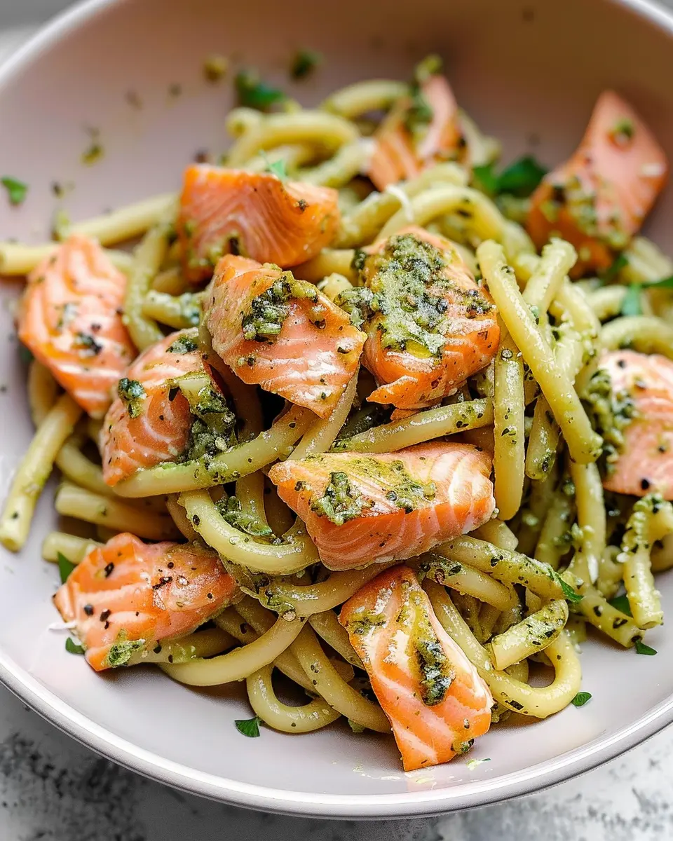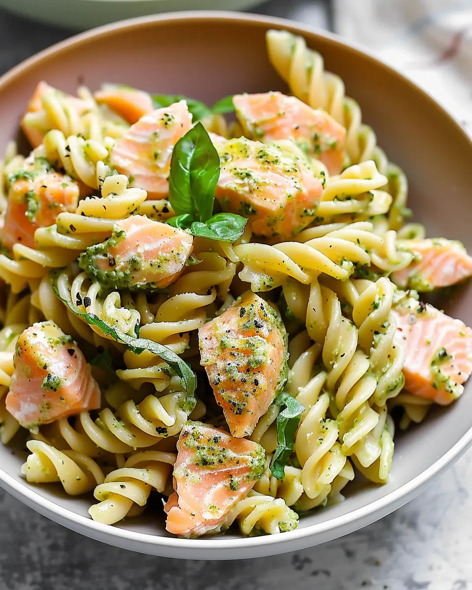 This Salmon Pesto Pasta is a creamy, indulgent dish that combines the rich flavors of salmon and pesto for a delightful meal.