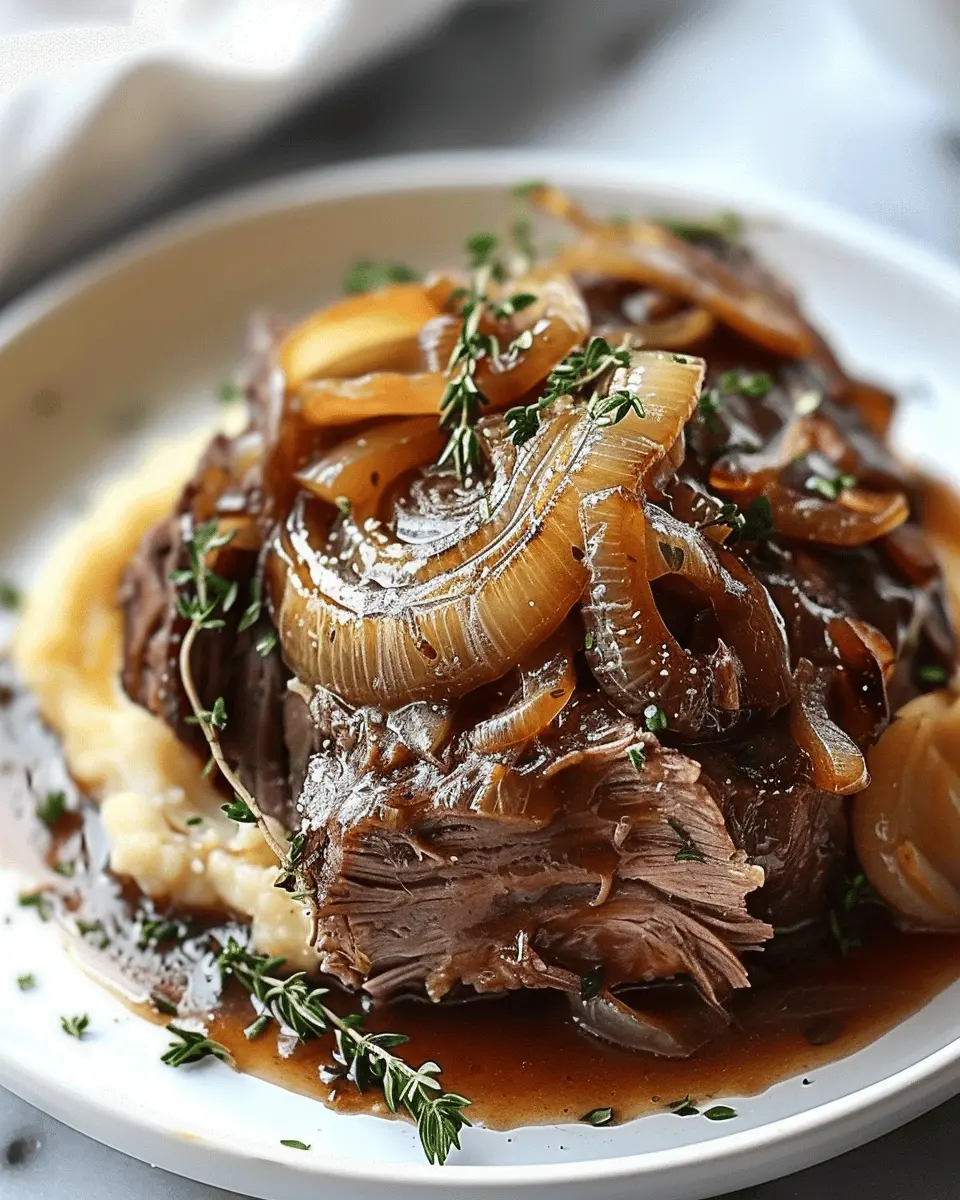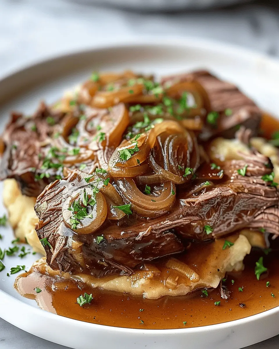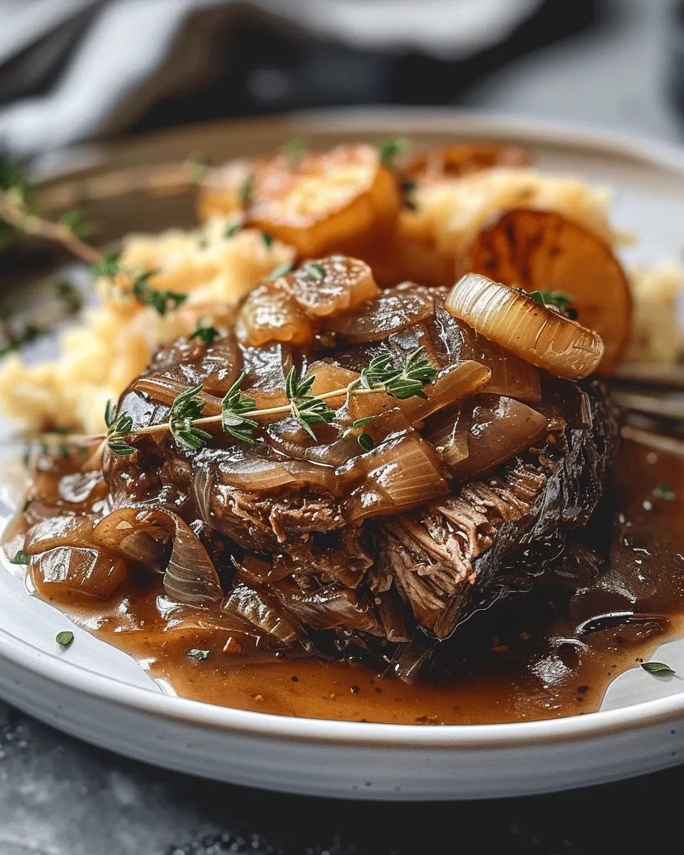 One of the reasons this dish stands out is its incredible flavor profile. The slow-cooking process allows the beef to absorb the rich essence of beef broth with subtle hints of garlic and herbs, complemented perfectly by the sweetness of caramelized onions. This unique combination ensures a taste sensation that’s both comforting and gourmet, making it perfect for any occasion.