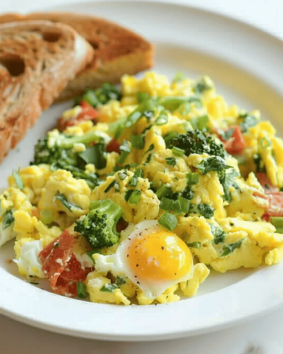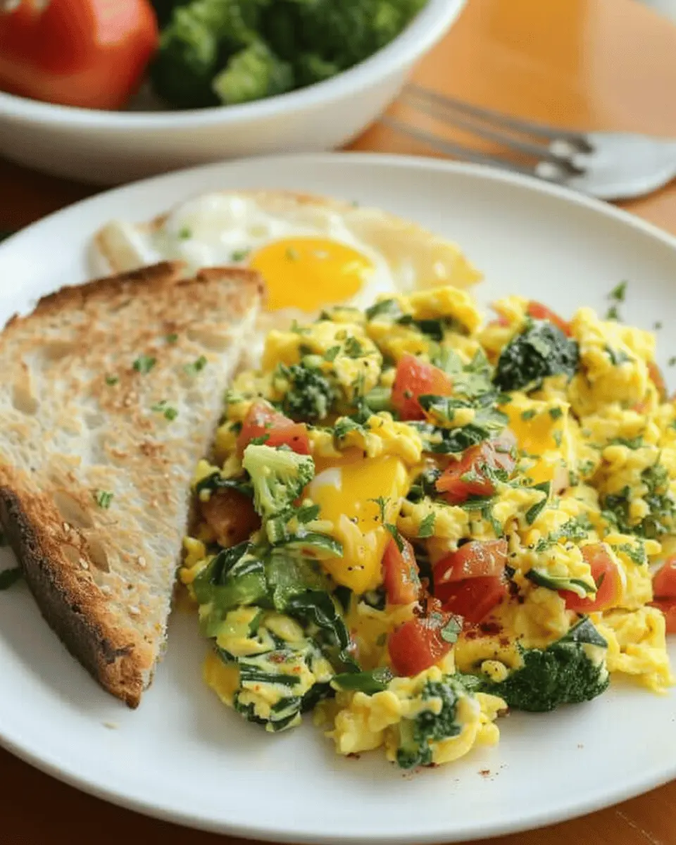 PrintScrambled Eggs with Veggies: Easy Toast Perfection with Turkey Bacon