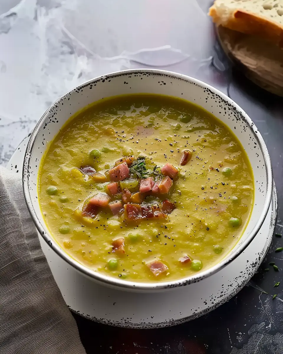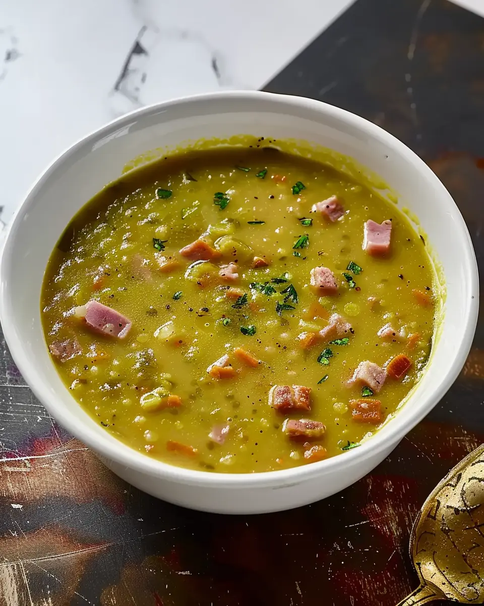 A comforting and delicious soup made with split peas and turkey bacon, perfect for any occasion.