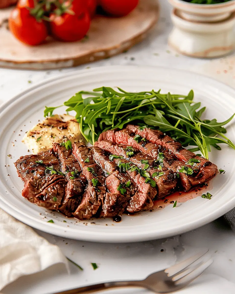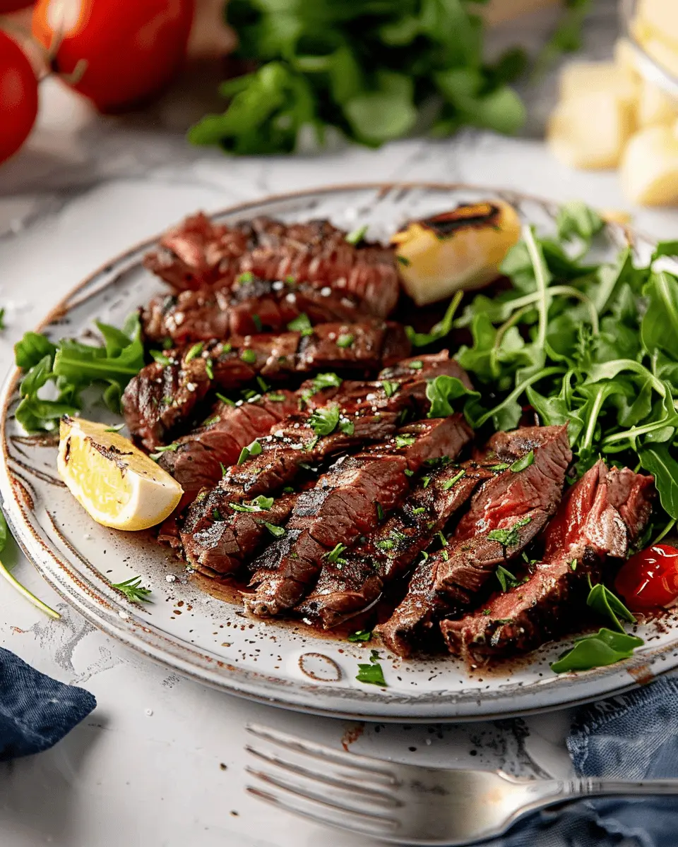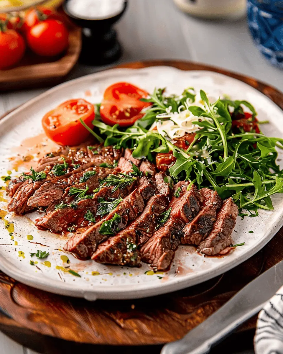 - Arrange the Slices: Scatter the sliced steak on a platter or individual plates, and generously top with the fresh arugula salad. Drizzle any leftover salad dressing over the top.