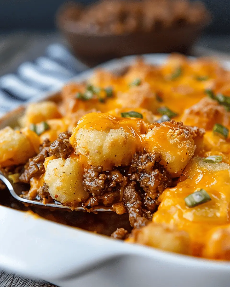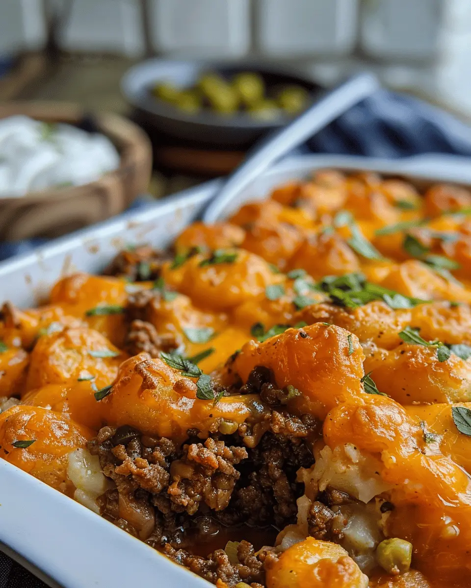A delicious combination of tater tots and ground beef, perfect for family dinners.