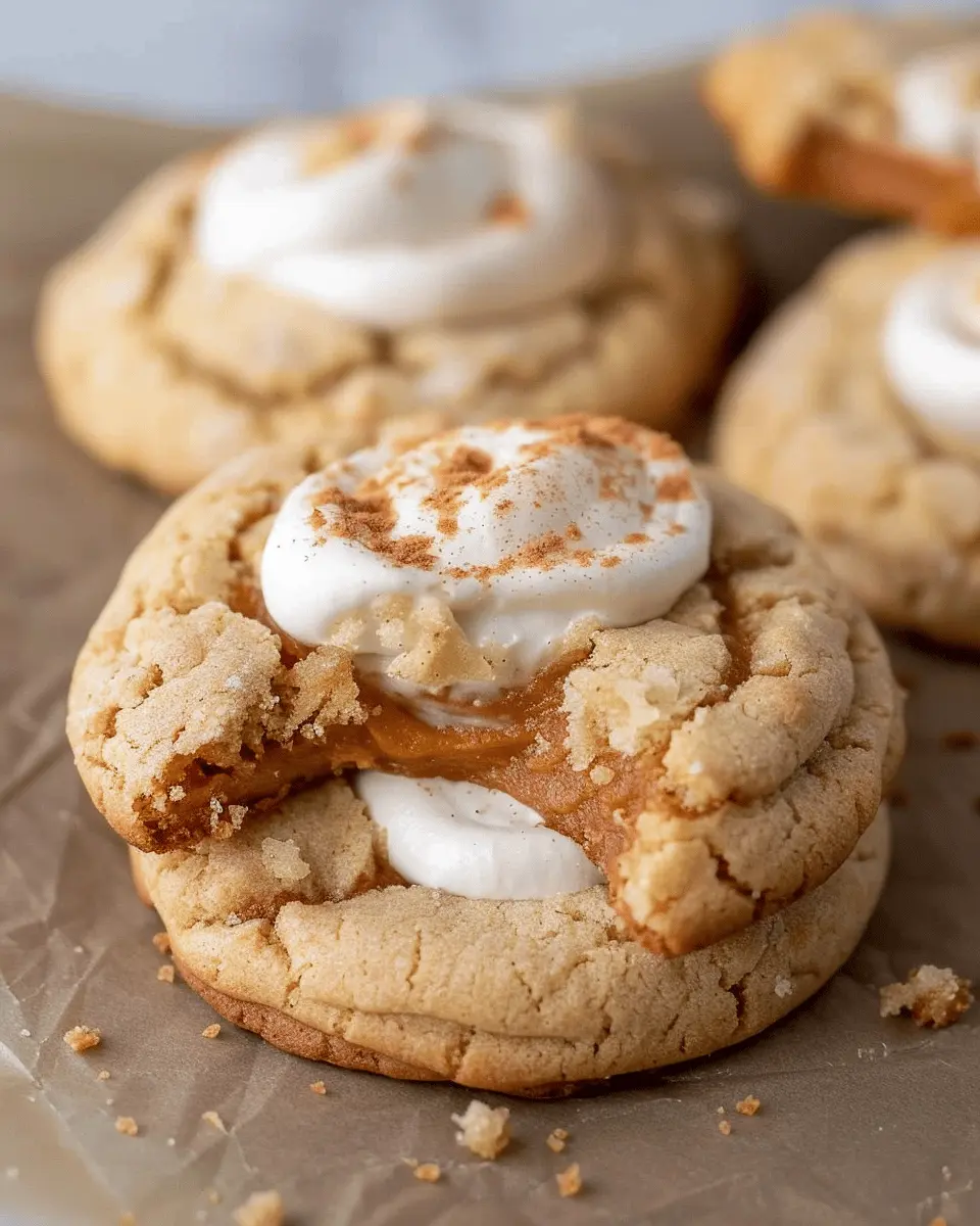Finally, it’s time to bring everything together! Take one of your cooled cookies and gently press it down into a small dollop of pumpkin pie filling. Then, top with a generous scoop of whipped cream. Feel free to sprinkle a dash of cinnamon on top for that warm touch.