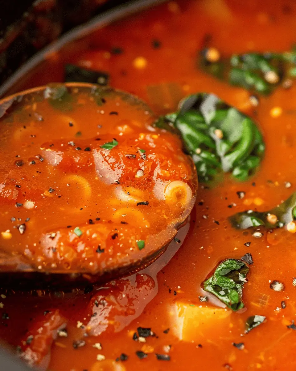 With the pasta cooked to al dente, reduce the heat and fold in the fresh spinach. Allow it to wilt into your soup for just about 2 minutes. Not only does this step boost the nutritional content of your Tomato Florentine Soup, but it also adds a vibrant green color that makes the dish visually appealing.