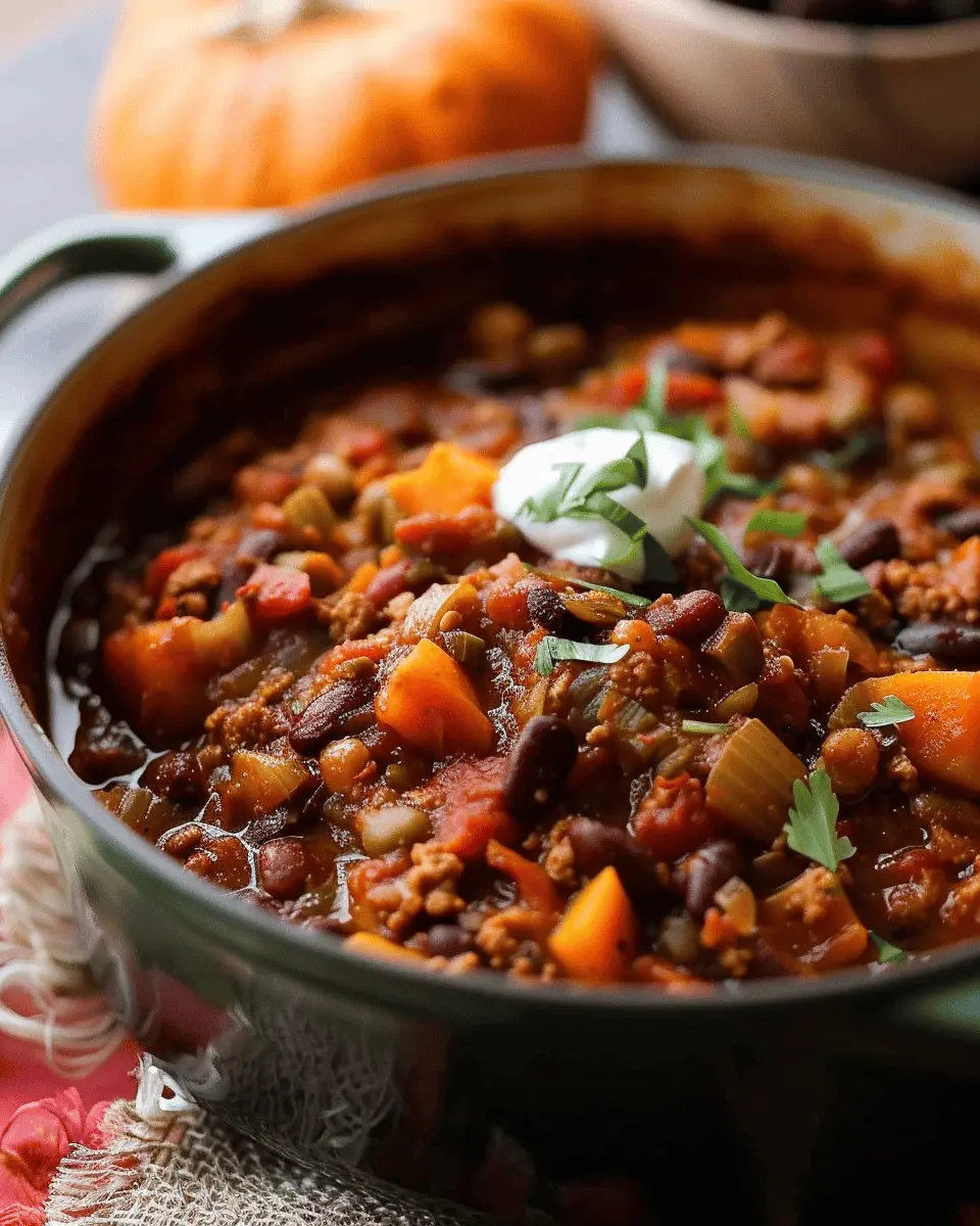 A warm and hearty vegetarian chili made with pumpkin, beans, and spices, perfect for chilly evenings.