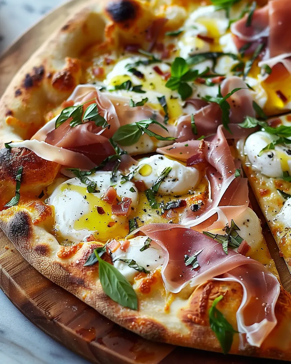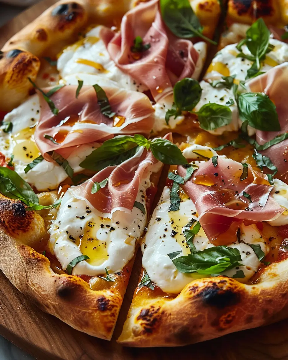 This pizza combines the savory flavor of prosciutto with the sweetness of honey and the creaminess of burrata, making it a gourmet delight.